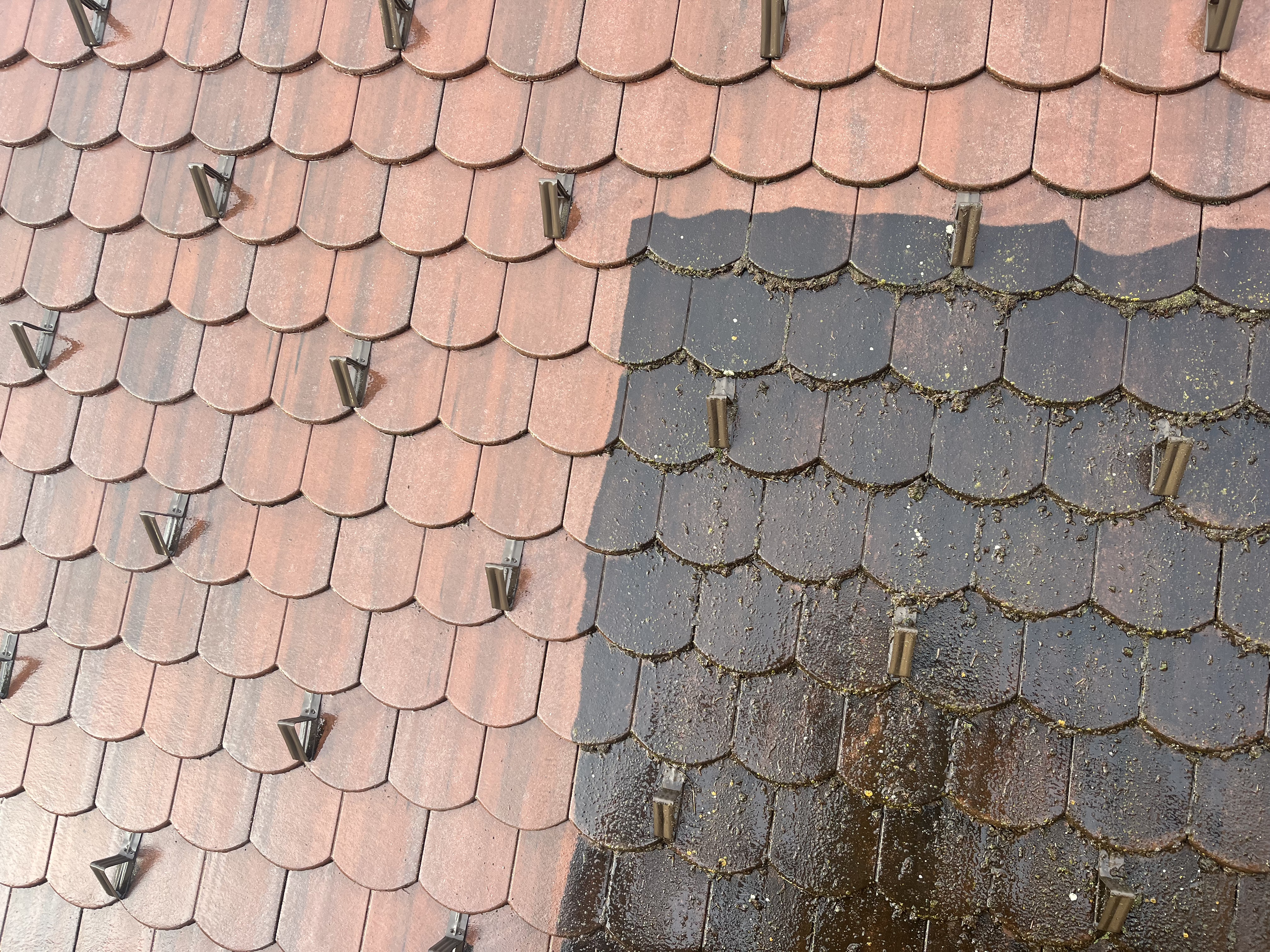 It's like pulling weeds. If you don't pull it out with the root, the result is nice to look at, but only for a while.Our result is always a thoroughly cleaned roof and above all the elimination of 100% of moss, algae, moulds including their germs. Only a roof cleaned in this way is perfectly prepared for impregnation or coating.
